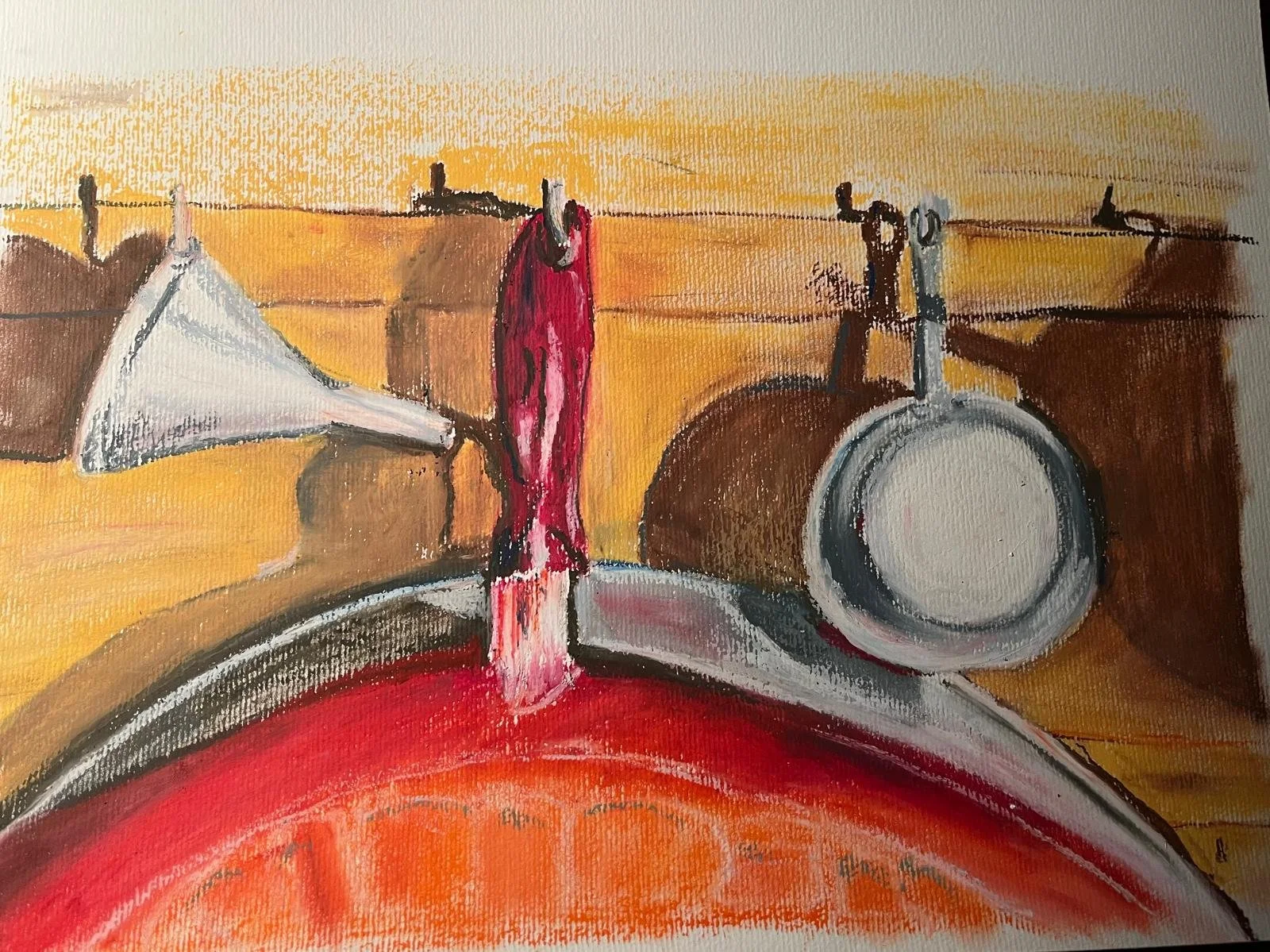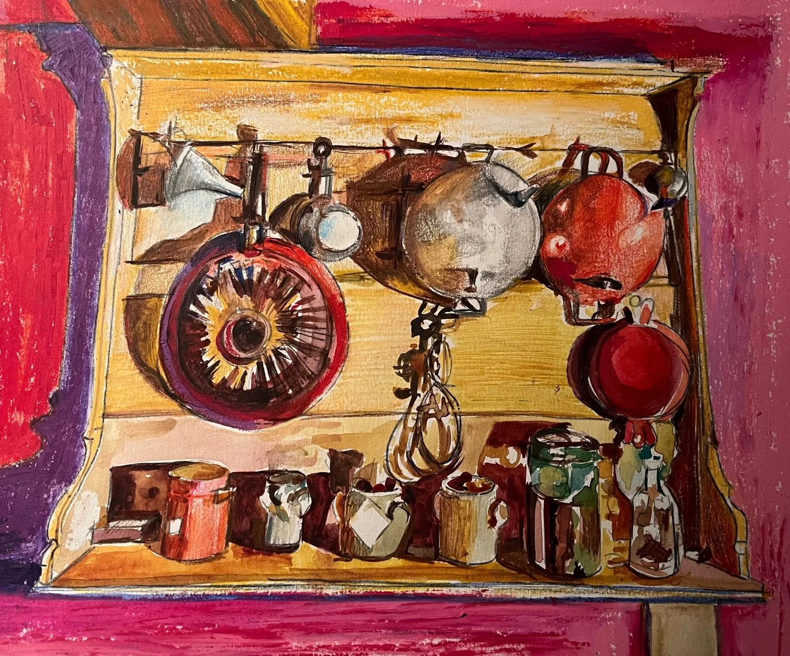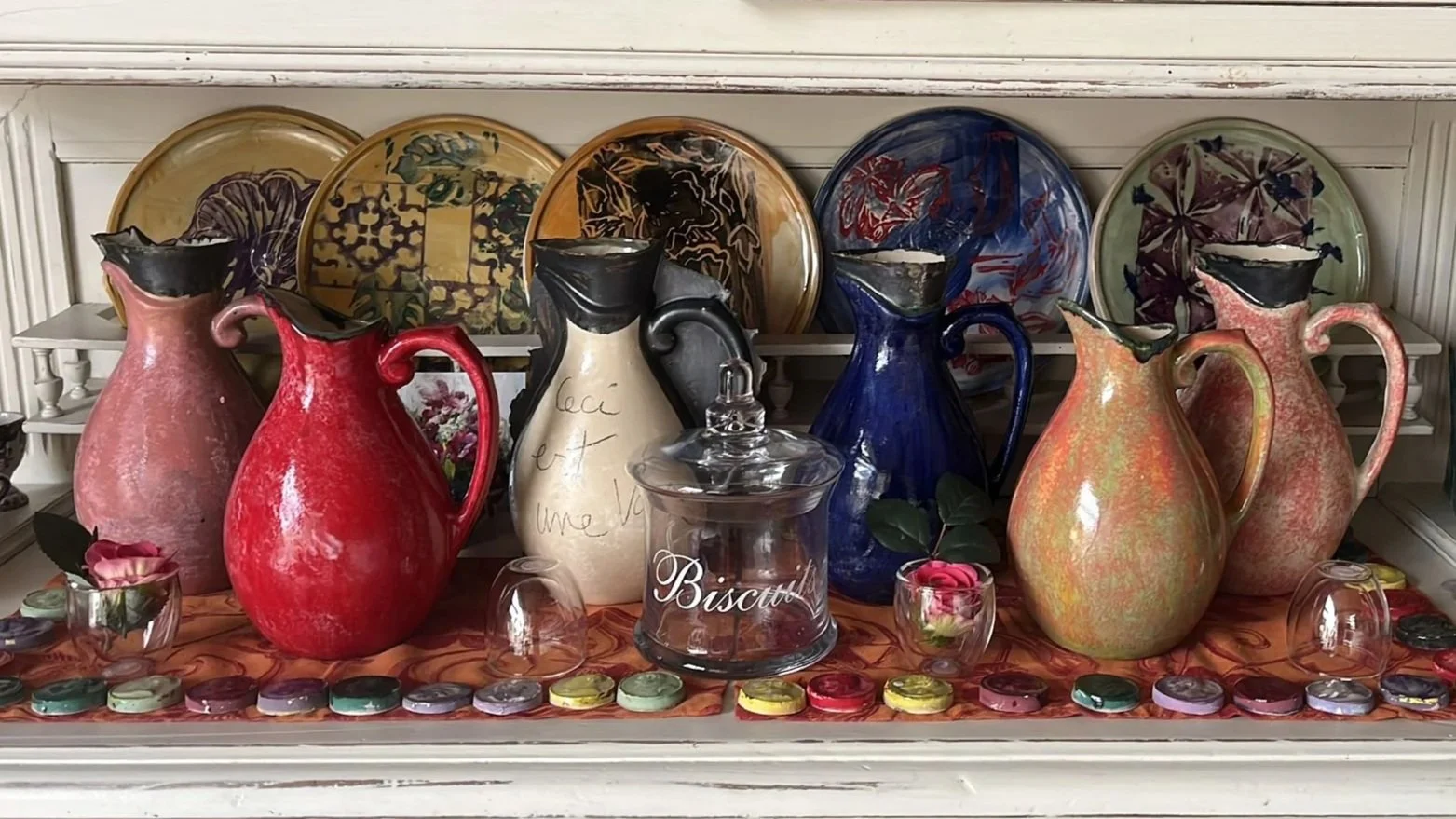 She makes her colours dance, and her lines are curves of life that are equally appreciated in her paintings and ceramics. Her creations are warm and radiant. She is an artist of attention, caring for everyday objects, some broken, others neglected. Antique dishes, kitchen utensils, doorknobs, wooden panels; everything is reborn in her eyes with expressions full of vitality.