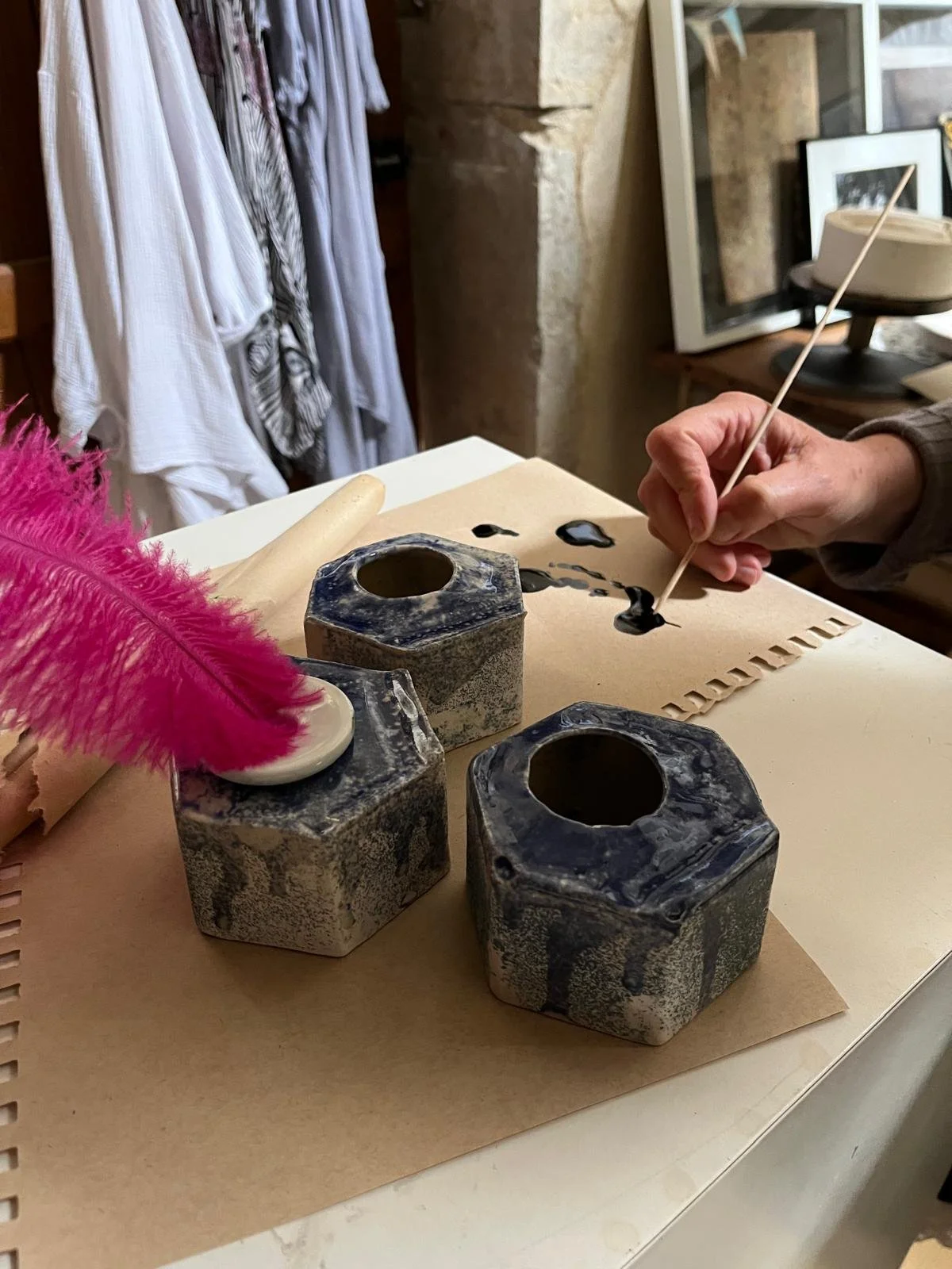 Karin Bain is an artist who reveals the beauty of everyday life, of materials, forms, and colors. In her studio in the Brionnais region, all the arts converse, allowing her to approach the existence of beings and things. Animals, flowers, fossils, but also everyday tableware. Everything finds its place in her open and gentle, delicate and benevolent universe. Her lines are bold, capturing the unique character of each being and each thing. In her artworks and in the classes she teaches, art animates and life infuses matter.